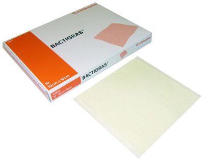 BACTIGRAS® (Smith & Nephew) is a sterile paraffin gauze dressing impregnated with Chlorhexidine, designed to provide antiseptic protection while allowing the wound to drain freely. It is soothing, non-adherent, and helps prevent infection in wounds, burns, and skin graft sites, reducing the risk of secondary contamination.